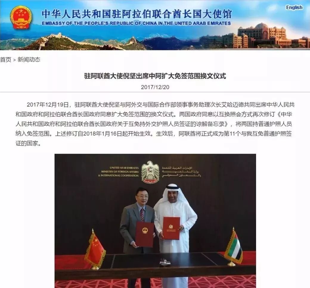 由此,阿联酋成为第11个与中国互免普通护照签证的国家。