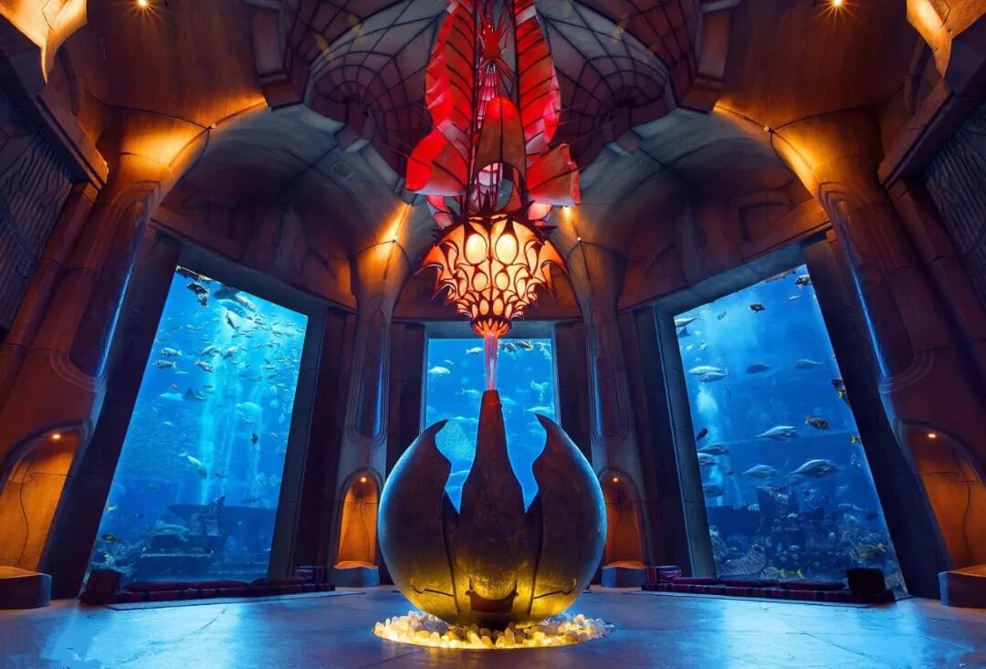 亚特兰蒂斯水族馆与外部免费水族馆明亮的环境有所不同,水族馆取名The Lost Chambers旨在营造出那种失落文明的神秘和幽闭感,内部幽暗空灵,仿佛无人踏足的深海囚牢,甚至还配有空灵迷幻的海底背景音。