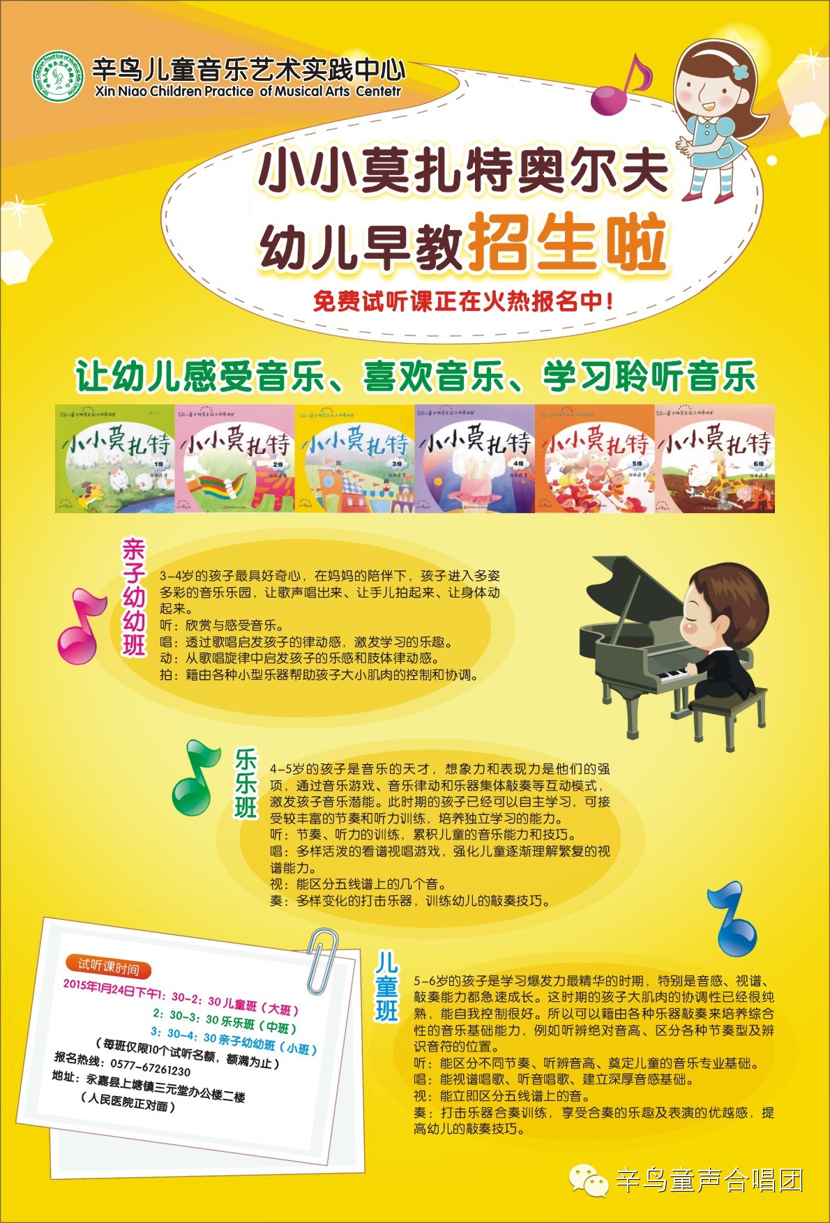 “小小莫扎特”幼儿奥尔夫音乐培训入驻辛鸟儿童音乐艺术实践中心,开三个年龄阶段的班级,现向全县3~6岁幼儿招生。免费试听课正在火热报名中!