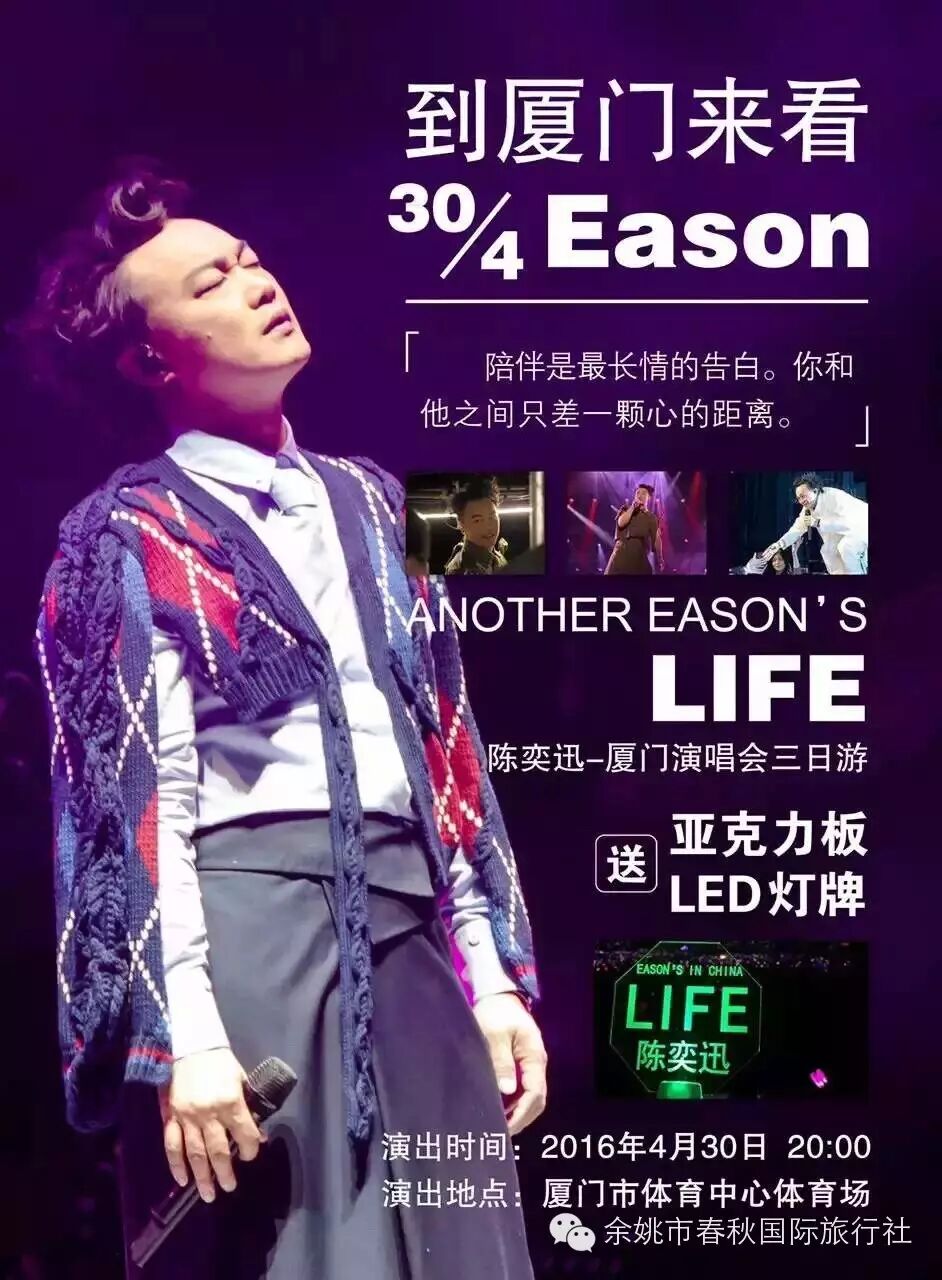第一天 4月30日 | 早上余姚北高铁站集合,乘坐动车赴厦门,当地导游厦门北站接团,后车赴酒店,酒店统一发车赴厦门体育场,观看当日20点开演的【ANOTHER EASON’S LIFE厦门演唱会】,演唱会结束统一地点发车赴酒店,省去您的因为散场人多只能走路回去酒店的烦恼。【赠送:贴纸,LED灯牌】 |