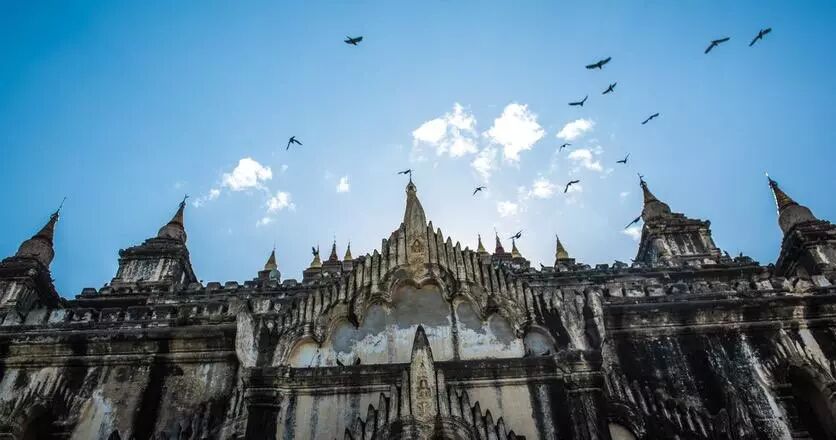 下午坐大巴,前往“表打他塔”(Pyathada),这是蒲甘最出名的日落塔之一,而你的视野正前方,瑞山陀、达玛扬基、苏拉玛尼、达宾纽等一系列塔群组成了一副非常壮丽的天际线。