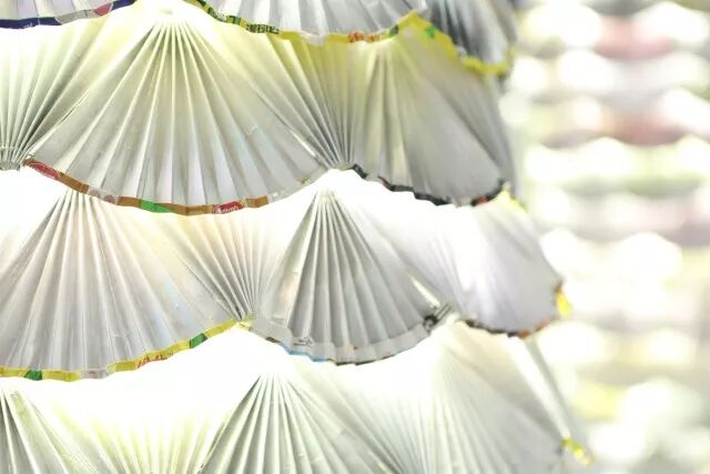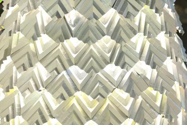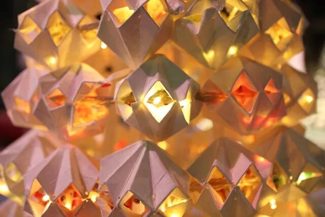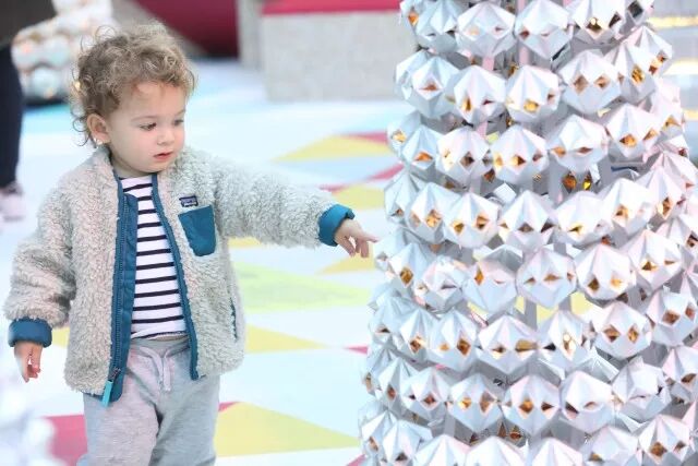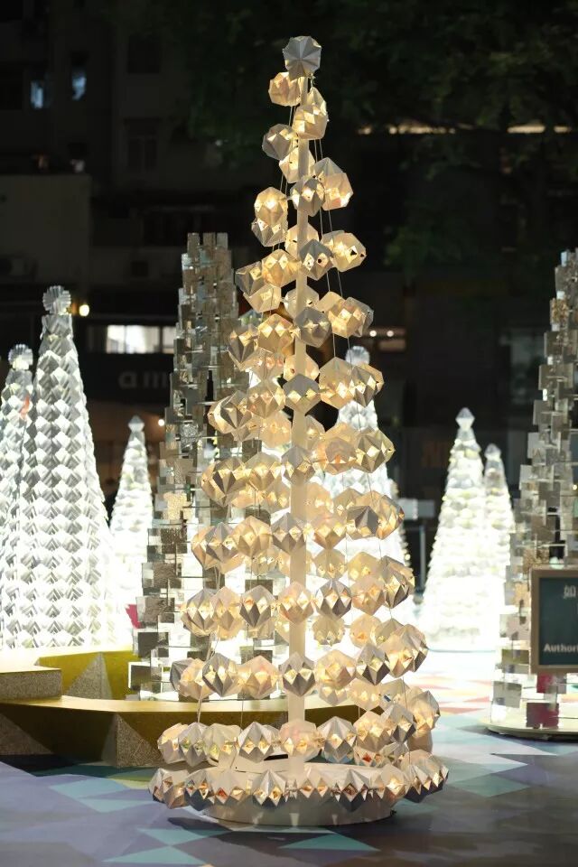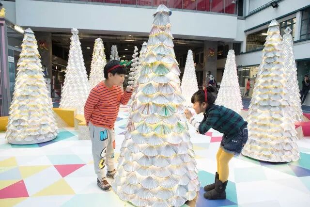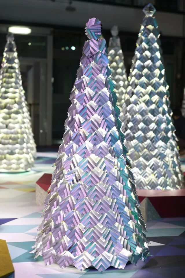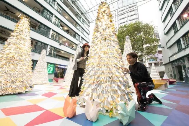 和参与种植的小朋友一样,将回收所得的纸包饮品盒细心折叠成一个个立体感十足的几何组件,塑造出圣诞树的形态,感受设计带来的美好。