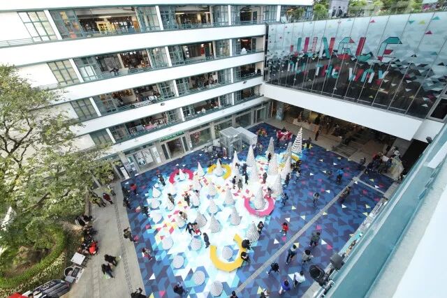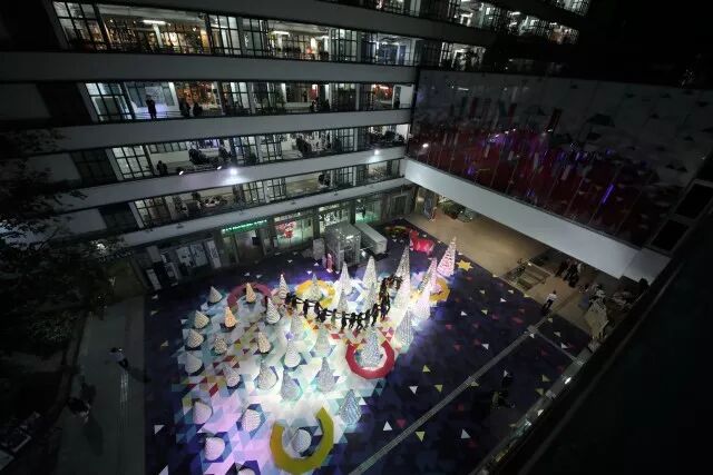 从PMQ两栋大楼俯瞰发现当中巧思,一棵棵小树原来在地面构成了巨型圣诞树的动人轮廓,不起眼的饮品盒通过「设计」成就出震撼人心的视觉艺术。