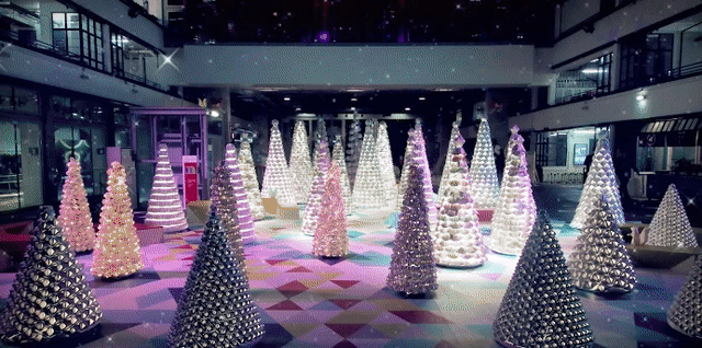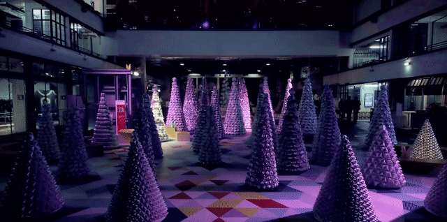 从12月15日开始,这36棵由纸包饮品盒再生的圣诞树将在PMQ庭院中庭孕育成长,等待你来森林穿梭感受。