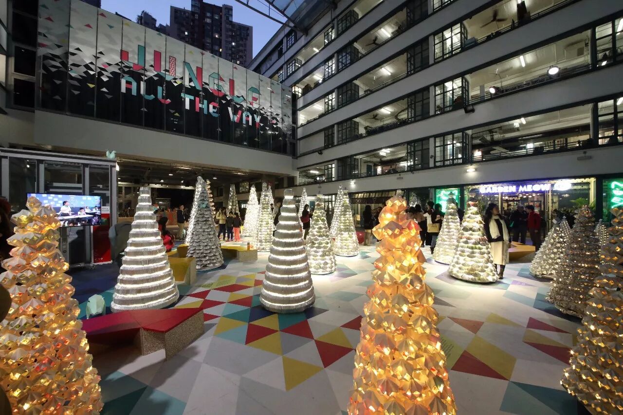 圣诞是传颂爱的日子,除了爱自己,爱身边人,我们亦爱地球。PMQ元创方伙拍「AaaM建筑设计工作室」及「绿色力量」,让爱和设计发挥微妙而巨大的作用,将超过15000个回收纸包饮品盒转化成大型圣诞装置「Jungle All the Way」,让纸盒里的银色铝箔面折射节能灯光,用一棵棵「环保」圣诞树打造出童话般闪闪发亮的圣诞森林。