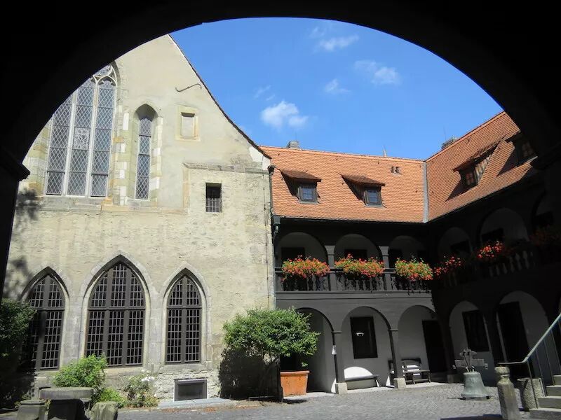 在埃森纳赫,离马丁·路德故居以及巴赫老屋不远处,就是圣方济各修道院寄宿学校,马丁·路德及后来路德派音乐大师巴赫的母校。7月的夏树鸣枯蝉,教室彩绘窗口,仿佛仍能听到孩子们用拉丁文唱诗的声音。远望是高山上的瓦特堡。避难的马丁·路德幽居期间,把《新约》从希腊文译成德语——“夜间我听到魔鬼在楼梯上推下酒桶。”他说。