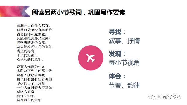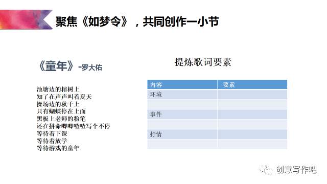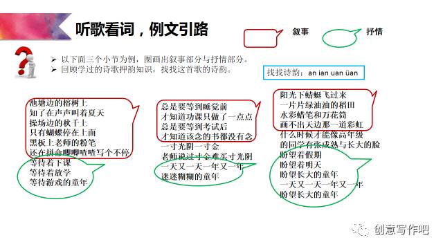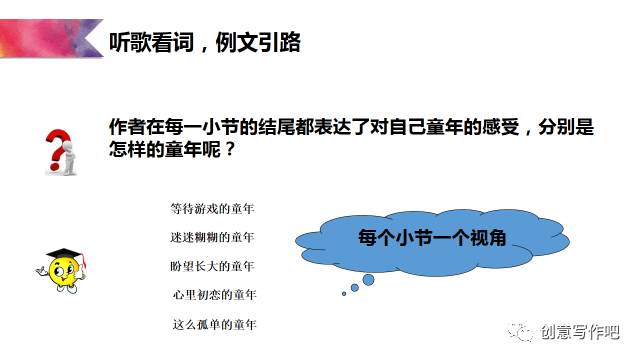 接下来,再具体聊聊指导学生怎样写《童年》歌词: