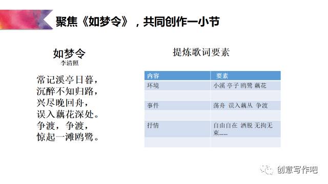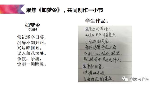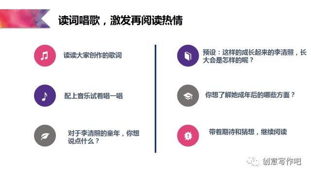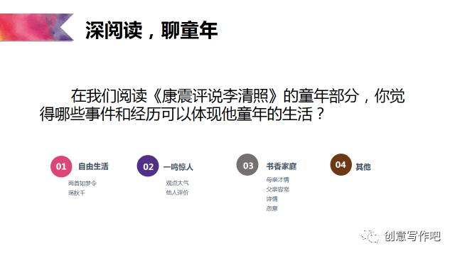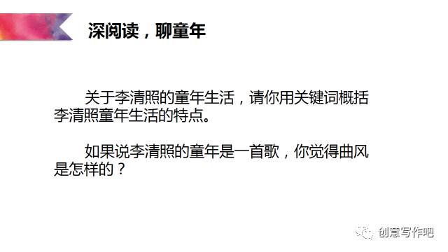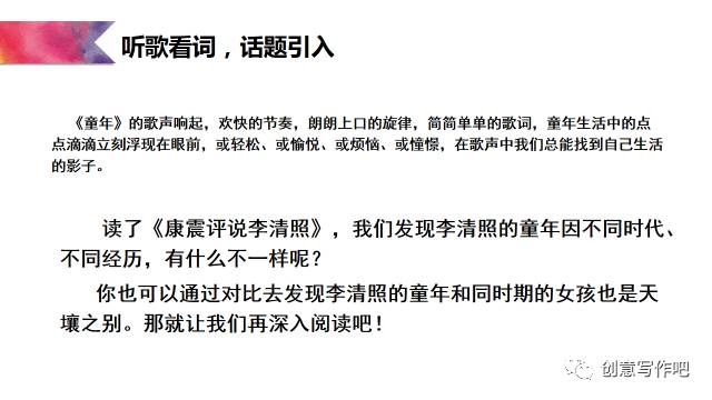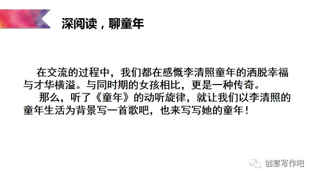 王荣生说:在整本书阅读中,所有的教学活动都应将学生引导向捧起书本的再阅读。于是,我创设活动如下:听罗大佑的《童年》产生共鸣,为李清照创作一首童年。具体操作如下: