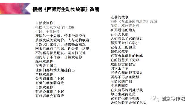 说起仿写歌词,可能大家会觉得有点太高难了。其实这样的写作很好玩,学生有玩文字、玩学习的感觉,能够自已作词唱出来,非常有成就感。先跟大家分享两个学生在读《西顿野生动物故事》改编的歌词,建议您跟着节奏哼唱起来,你会找到文学爱好者的嗨情怀!