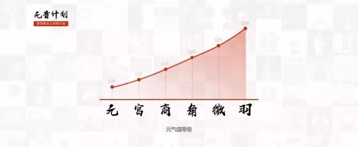 音乐人可以通过上传音乐作品、发布动态、作品被收听、收到赞赏等来增长元气值,而这个元气值与扶持服务直接挂钩。元气值划分为6个等级“元 宫 商 角 徵 羽”,不同等级享受不同的扶持。