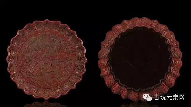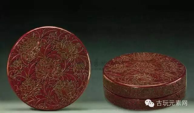 明代雕漆漆器中有黑色、红色(紫色),里面都是黑漆,大多有段纹。外面雕的花,没有硬棱,有光亮,非常坚硬。有些带黑纹的漆器,是因罩漆时,先上一层红漆,再上黑漆,如此反复多次后,然后雕刻,所以横看有黑纹。