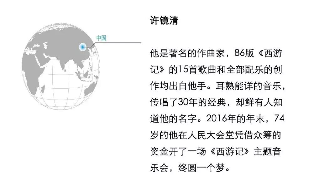 许镜清:说句真话,来找我聊天的人,他们大多都是想见见我,认识一下,我不但要陪着聊天,还要送我自己花钱制作的《西游记》歌曲光盘。我当然希望,第一,他们能记住我,第二,听到西游记音乐能觉得好听,可以合作开一场音乐会。那段时间,我可能送出去有100多张光盘。我记得有两个小伙子,他们说一定尽全力帮我办成音乐会,有一个人还说,这么好的音乐不办音乐会,天理难容啊。最基础的音乐作品有了,可最重要的因素——钱我没有啊。中国歌剧舞剧院的小伙子还帮我做了音乐会的PPT方案,里面很多图让我觉得很新鲜,我甚至想给他付款,他说不用,这只是帮您做了一点点事情。