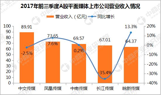 据中商产业研究院大数据库数据显示,2017年前三季度A股平面媒体行业上市企业中,中文传媒、凤凰传媒、中南传媒、长江传媒、皖新传媒这五家企业的营收排名前五。其中,中文传媒排名第一。
